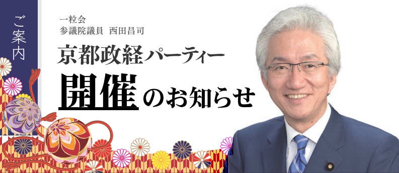 さて、西田昌司議員におかれましては、自民党政調会長代理、そして自民党税制調査会幹事として、国民経済や安全保障など山積する課題に 全力で取り組んでいただいているとともに、コロナ禍から国民を守るため、消費税減税を訴えるなど、「経世済民こそ政治家の使命」の信念のもと、懸命に活動をされております。