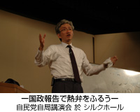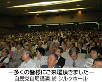 皆様には、日頃より温かいご芳情とご支援を賜り、誠に有り難うございます。過日の「自民党時局講演会」には会場一杯のお運びを頂きましたこと、後援会長として心より御礼申し上げます。 さて、この度の講演会は昌司議員が国会議員になって初めての大きな国政報告会とあって、どんな話をするのか非常に楽しみでありました。