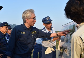 二之湯府連会長と由良川流域の被害状況の説明を受ける