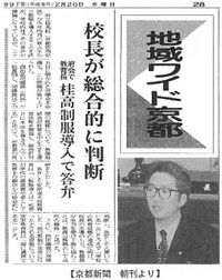 先日(2月25日)京都府議会本会議で,桂高校の制服導入問題を取り上げ,府知事・教育長に質問をしました。いくつかの新聞にも取り上げられましたので,お読みいただいている皆様もおられることと思います。しかし,残念なことに余りにはしょった記事だったために,私の教育に対する質問が何か「制服」の導入という形のみにとらわれているかのような印象になっていました。そこで,質問の内容を振り返りながら,教育の何を問い正したかったのかをまとめてみました。