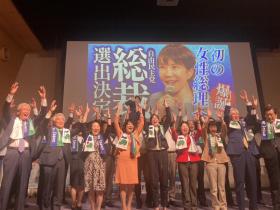 総裁選終了後、高市陣営結果報告会での万歳三唱
