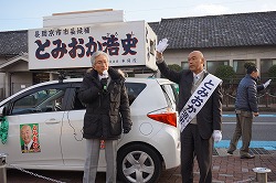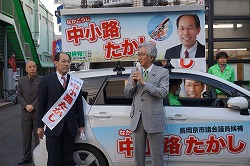 長岡京市長選挙のとみおか浩史候補ならびに長岡京市議会議員補欠選挙の中小路たかし候補の応援演説をいたしました