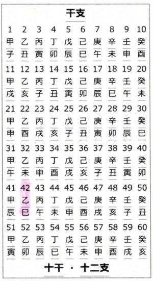 「干支(えと)」とは、「十干(じっかん)甲乙丙丁戊己庚辛壬癸」と 「十二支(じゅうにし)子丑寅卯辰巳午未申酉戌亥」の組合せなのです。