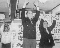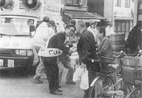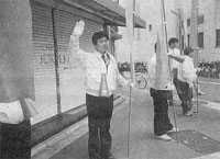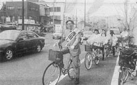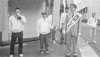 朝7時にターミナルで朝立ち、8時より選挙車で街宣、午後は候補者自ら自転車に乗り、夕方には「Show youの旗」を先頭に歩いての桃太郎作戦です。あわただしい1日が終わりましたが、5日目は雨。午後からの自転車、桃太郎は中止と決定し関係者に連絡しましたところが、2時ごろから雨は止みました。もしやと思い選挙事務所へ駆け付けると、やはり候補者はすでに自転車に乗り換えて、事務所に居合わせた昌友会員と共に自転車で街宣活動に出発されていました。自転車の活動性と親近感を生かした銀輪部隊の発足の瞬間でした。